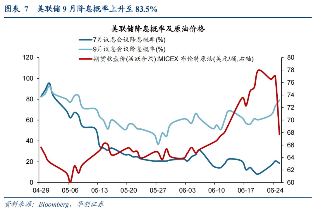 A股波动率压制极低后,以伊冲突缓和抬升风险偏好。油价从6月初65美元骤升至6/19的79美元,最近三天重新回落至66美元附近,缓解了原油进口国如日韩、中国、欧洲原油进口国的输入性通胀压力,以上股市最近三天均明显反弹。对美国来说,油价重新回落也降低了滞胀压力,叠加美联储官员鸽派发言,期货市场对7、9月降息概率从此前8.3%/60.3%升至18.6%/83.5%,对应美元指数重回下降趋势,缓解香港联系汇率制收紧压力,港股亦有明显上涨。