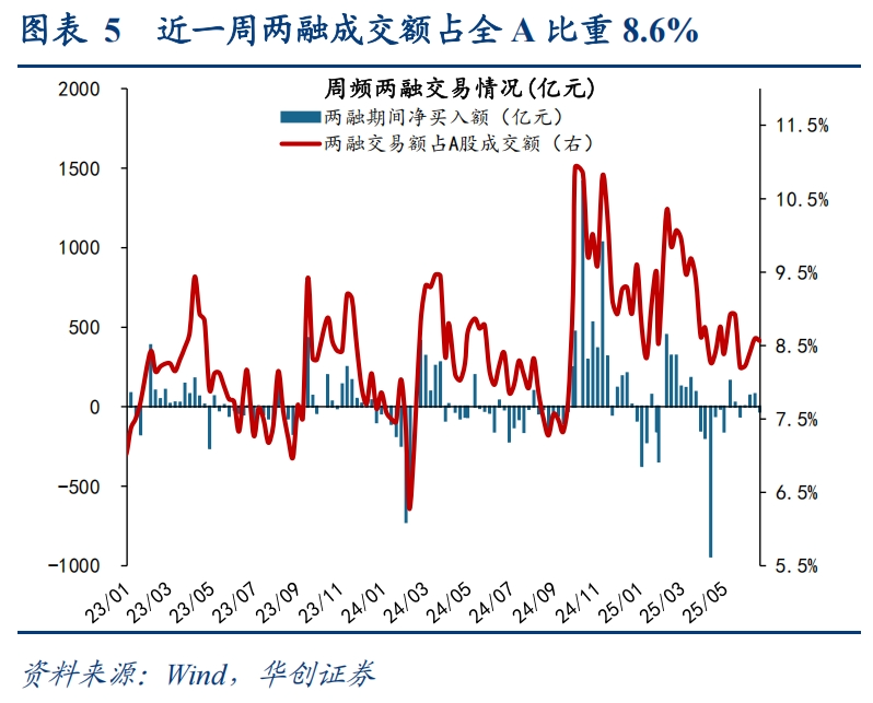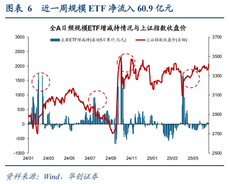 外资/杠杆/ETF流入迹象均不明显。北上日均成交额占全A比重最近一周6.5%,近一个月基本持平,显著低于去年8-9月9%左右的成交占比。两融余额最近一周1.8万亿,近一个月亦基本持平,两融成交额占全A比重8.6%,显著低于去年9-10月11%。规模ETF近一周净流入60.9亿元,虽较此前一个月周均净流入-64.5亿元有所回暖,但相比于4月准平准基金大幅增持时的周均流入355.3亿元仍有较大差距。