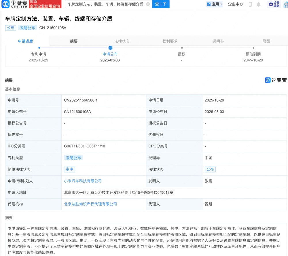 企查查APP显示,近日,小米汽车科技有限公司申请的“车牌定制方法、装置、车辆、终端和存储介质”专利公布。企查查专利摘要显示,本申请涉及人机交互、智能座舱等领域,其中,方法包括:响应于车牌定制操作,获取车牌信息及定制信息;基于车牌信息及定制信息生成目标定制车牌样式;将目标定制车牌样式匹配至目标车辆模型的牌照区域,得到目标车辆模型相匹配的定制车牌,以供在目标车辆模型展示页面将定制车牌展示于牌照区域。由此,不仅实现了车牌内容的动态化与个性化配置,还使得用户能够根据个人偏好灵活设置车牌信息和定制信息,并据此生成定制车牌,不仅提升了三维车辆模型中的牌照区域在外观呈现上的定制化能力与交互体验,也增强了智能座舱系统的互动性以及场景适配性,从而有效提升用户的满意度与智能化感知体验。